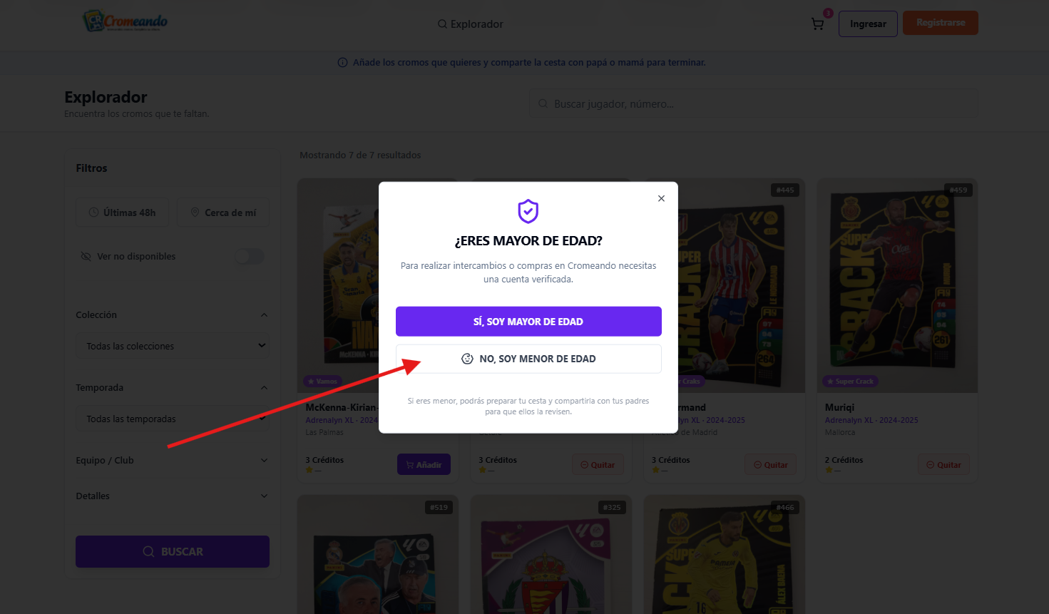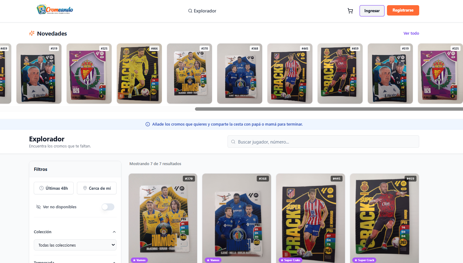 Sin registro puedes explorar y buscar cromos.