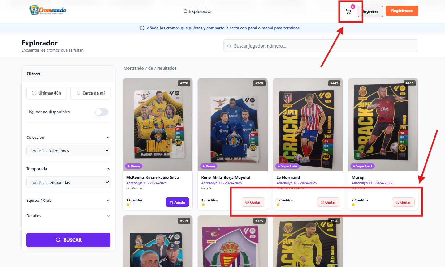 Puedes buscar por colección, temporada, equipo o jugador y filtrar fácilmente para encontrar justo el cromo que te falta. Son especialmente interesantes los filtros ultimas 48 horas y cerca de mi.