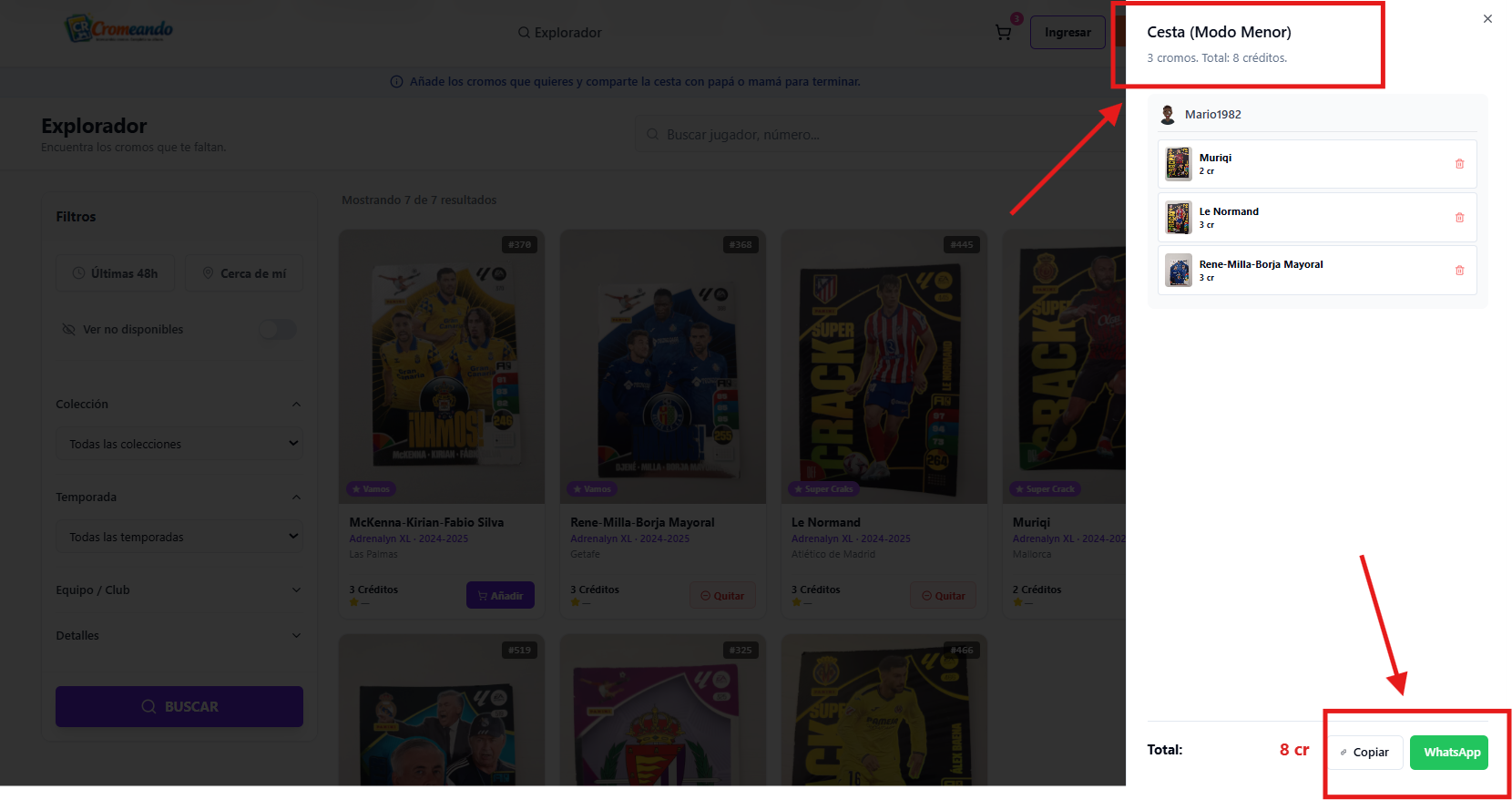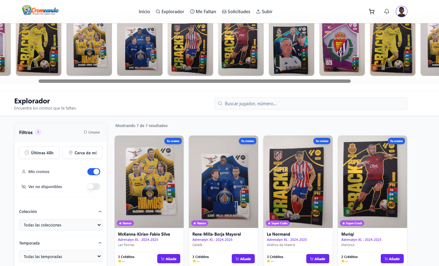 El explorador incluye filtros por colección, equipo, temporada y otros criterios, lo que facilita encontrar cromos concretos en segundos, sin listas interminables ni mensajes cruzados.
