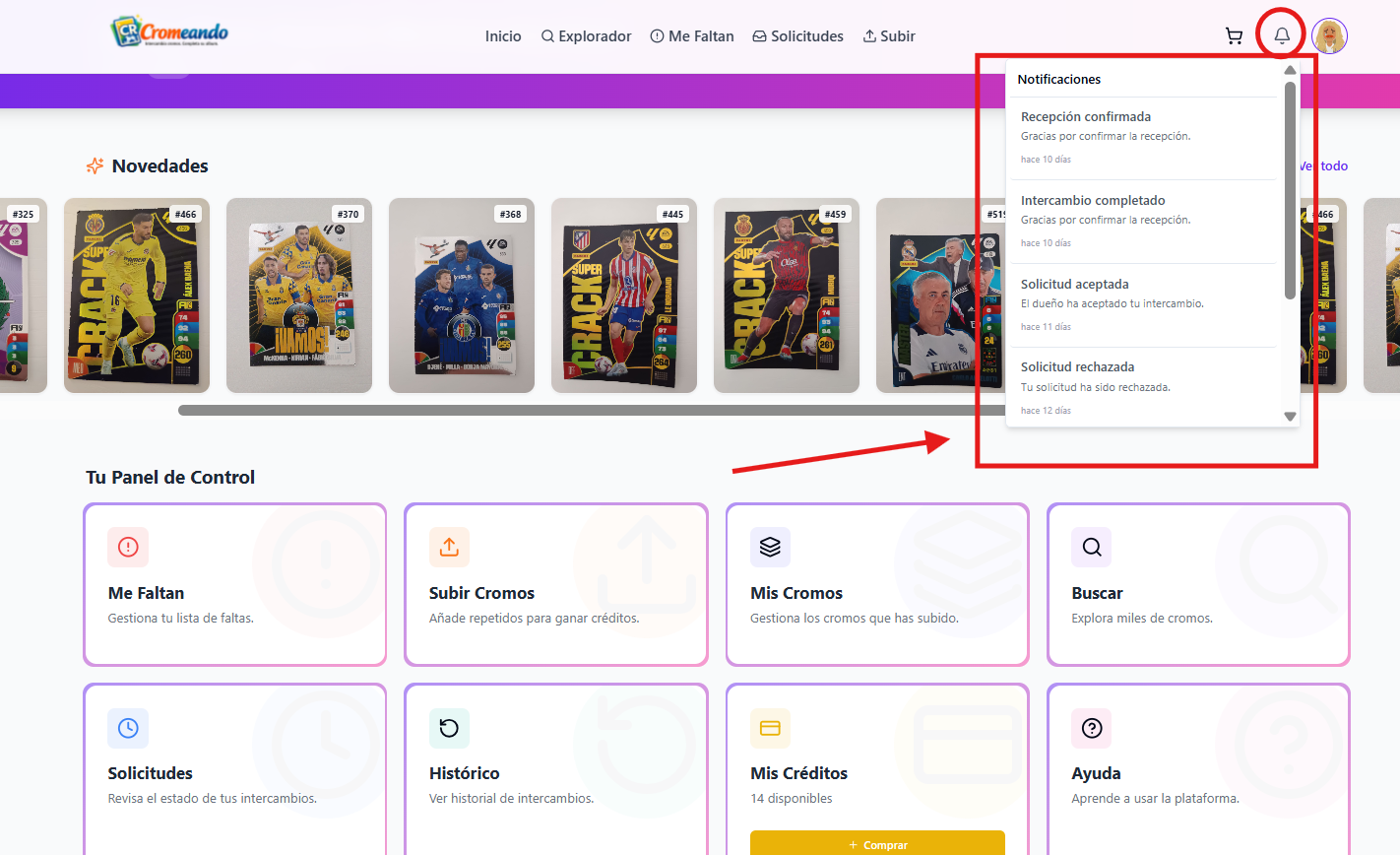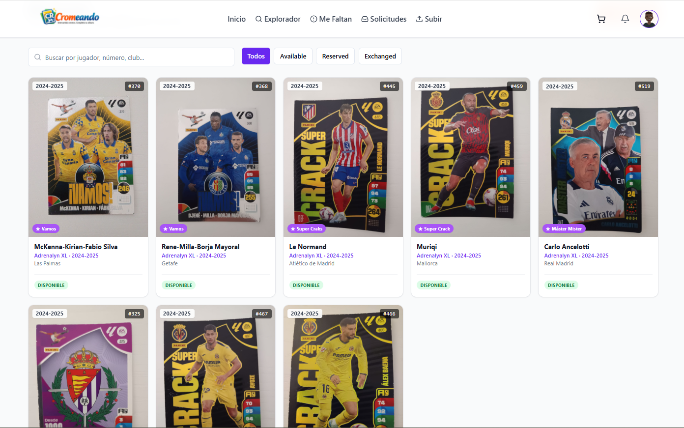 Desde aquí puedes ver tus cromos, subir nuevos cromos, acceder al explorador, gestionar solicitudes y seguir el estado de tus intercambios en todo momento.