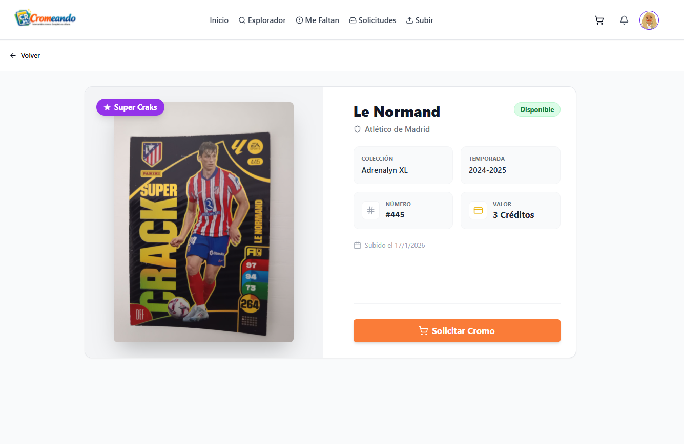 Al hacer clic en un cromo accedes a su ficha completa, donde puedes ver toda la información relevante antes de solicitarlo.