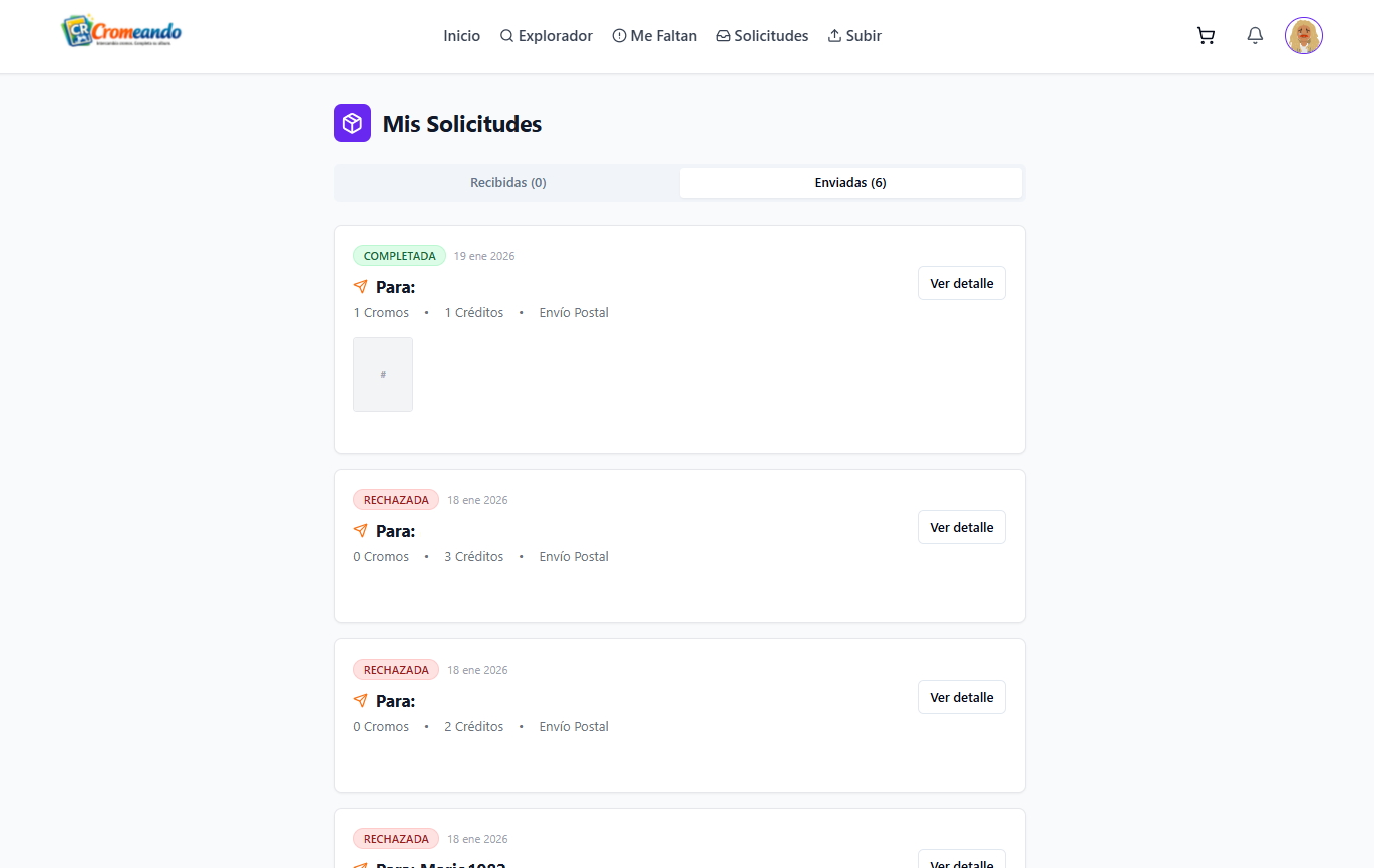 Cada solicitud muestra su estado actual, los cromos implicados y el valor en créditos, para que sepas en todo momento en qué punto se encuentra.
