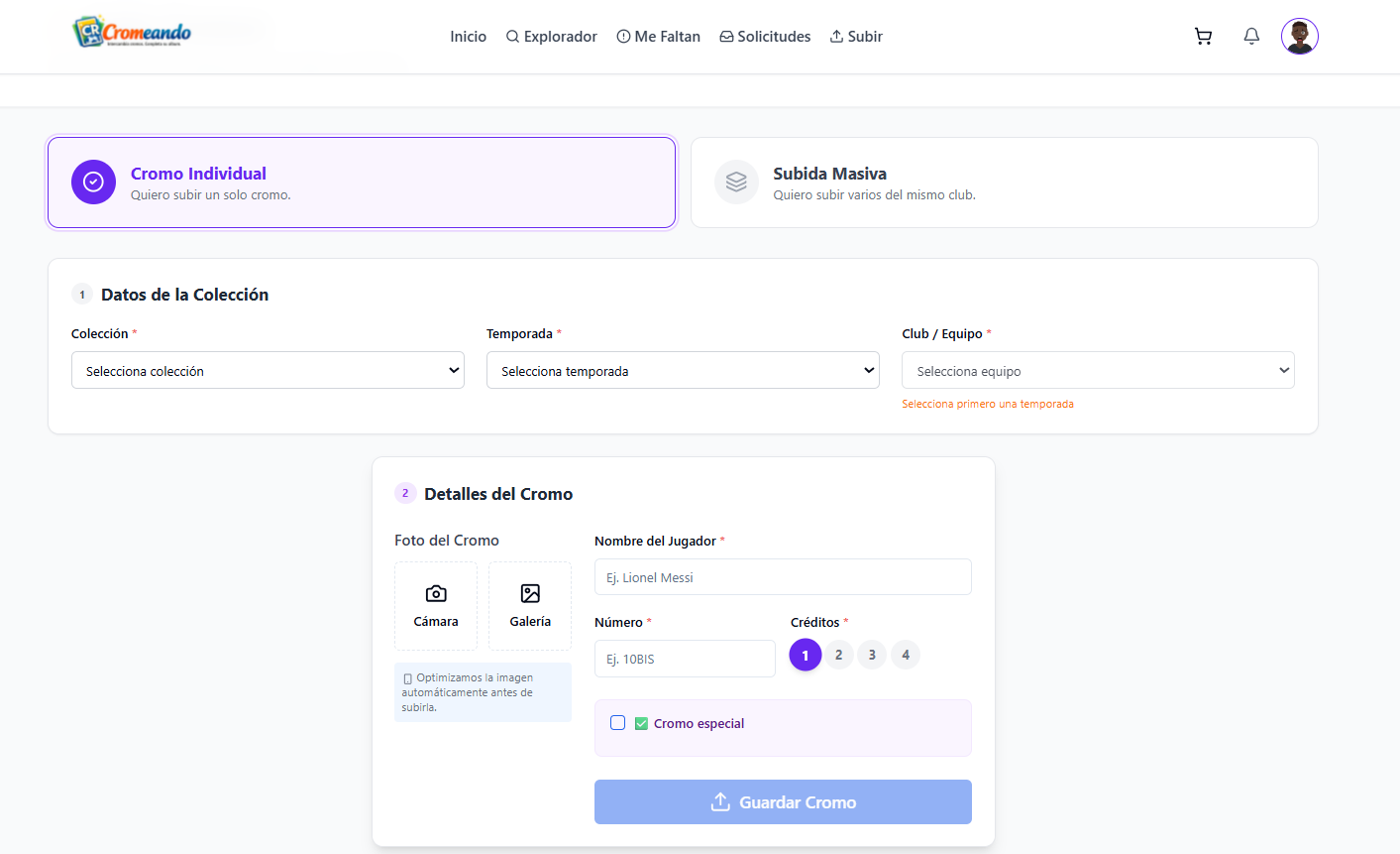 La subida individual te permite añadir cromos uno a uno, indicando colección, temporada, jugador y valor en créditos.