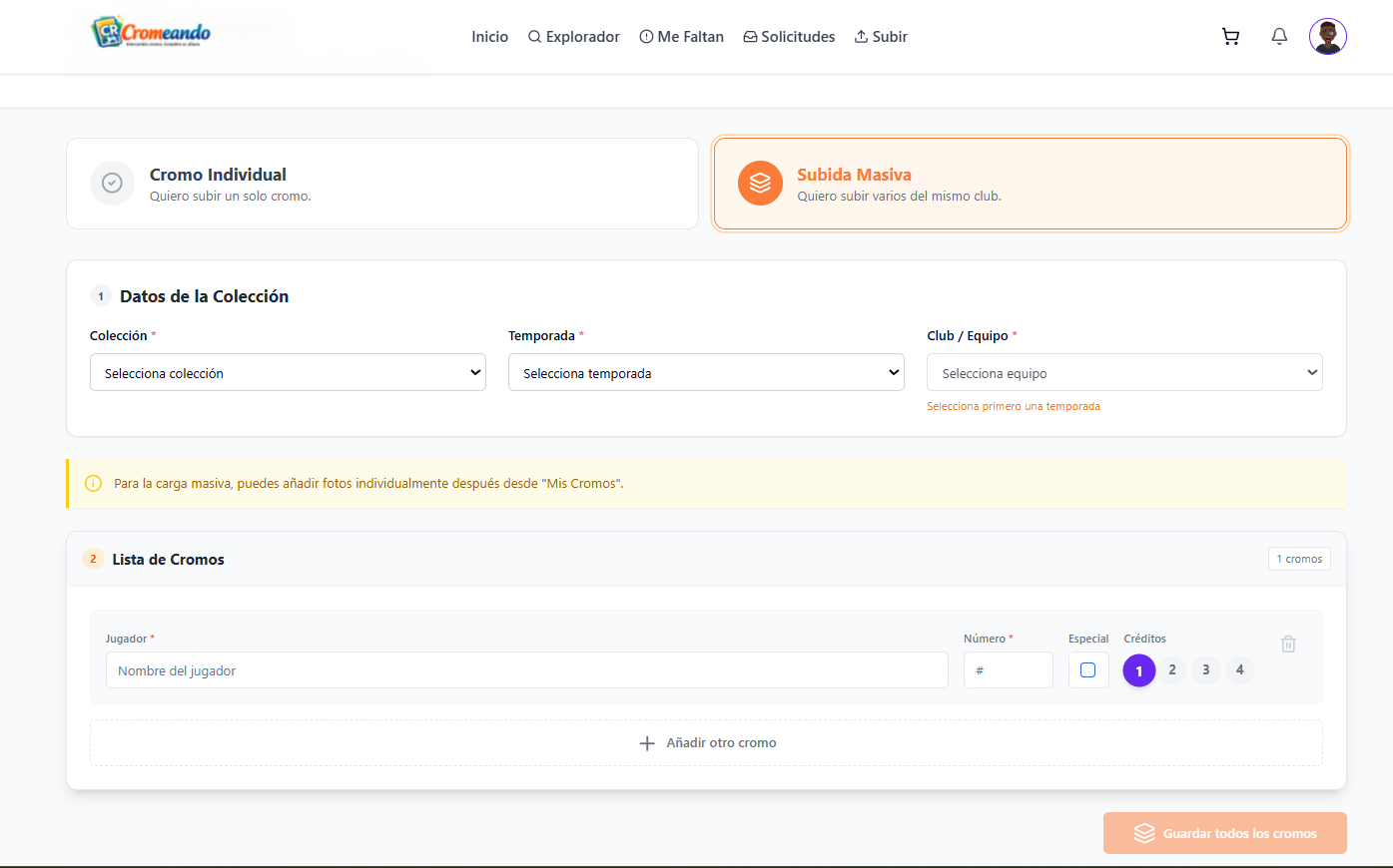 La subida masiva está pensada para añadir muchos cromos de una sola vez.