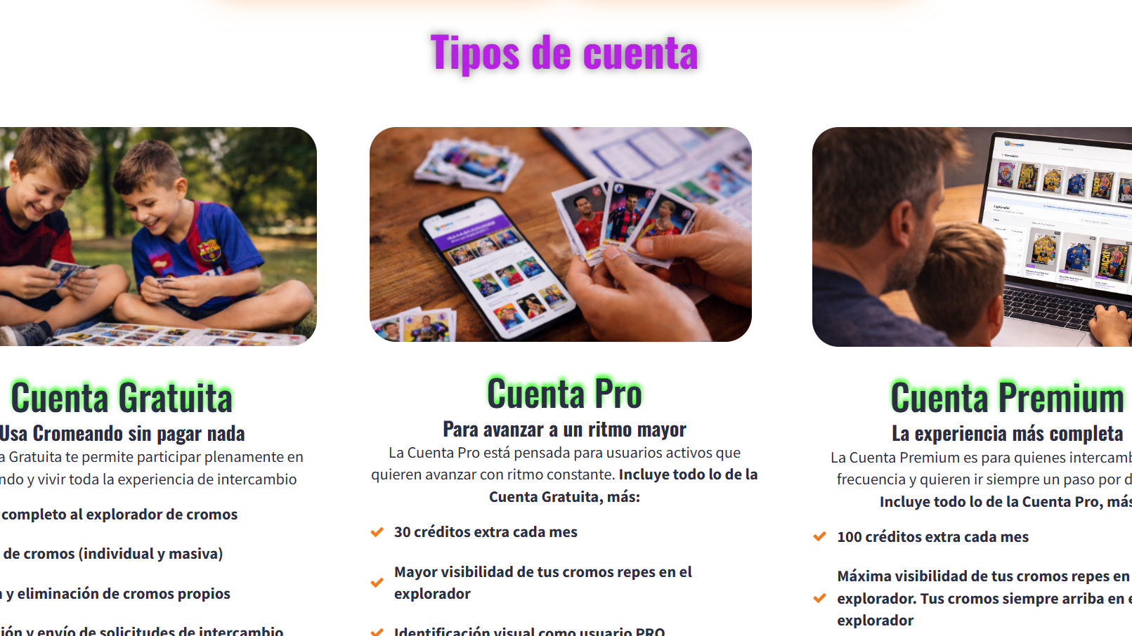 Cromeando ofrece tres tipos de cuentas: Gratuita, Pro y Premium. Con la cuenta gratuita es suficiente para usar la plataforma y tienes acceso a todas las funcionalidades. Las cuentas Pro y Premium solo mejoran la experiencia. Empieza sin pagar nada y accede a todas las funciones. Mejora tu cuenta solo si quieres intercambiar más rápido.