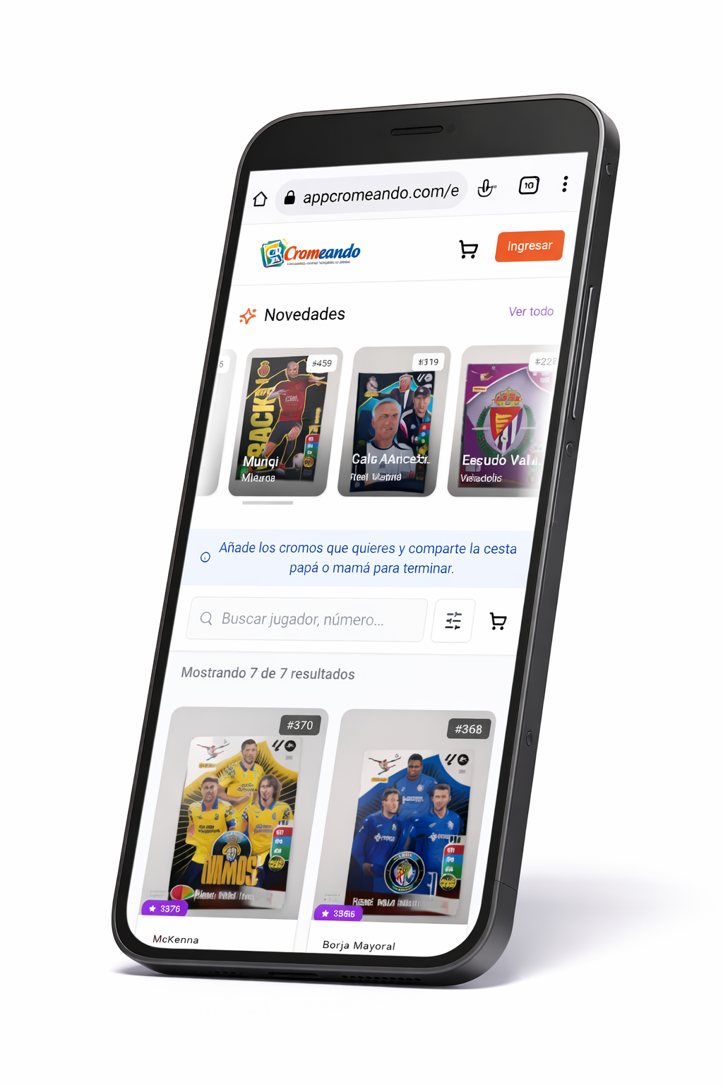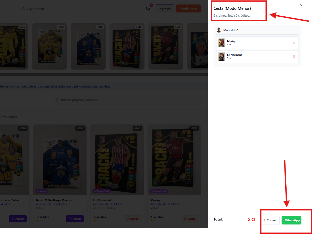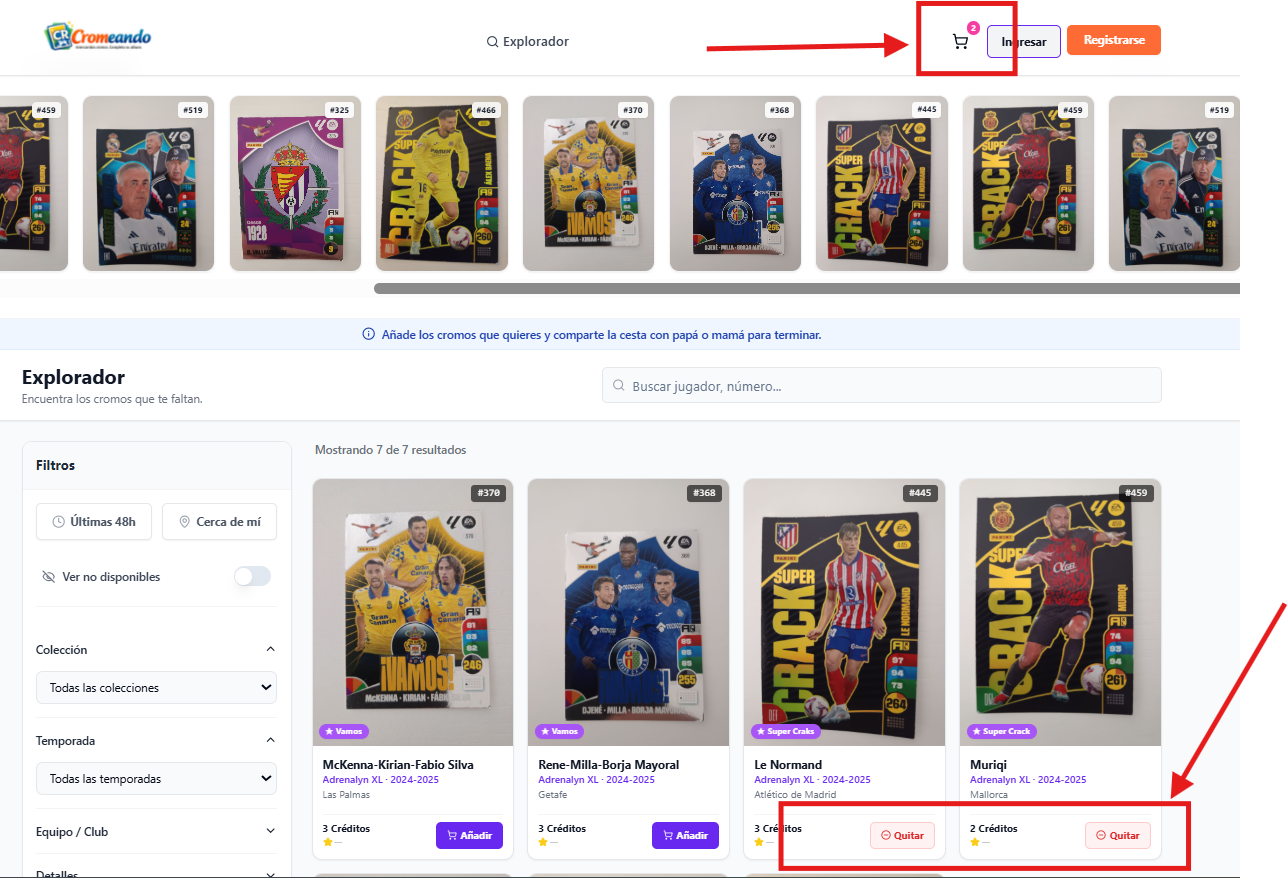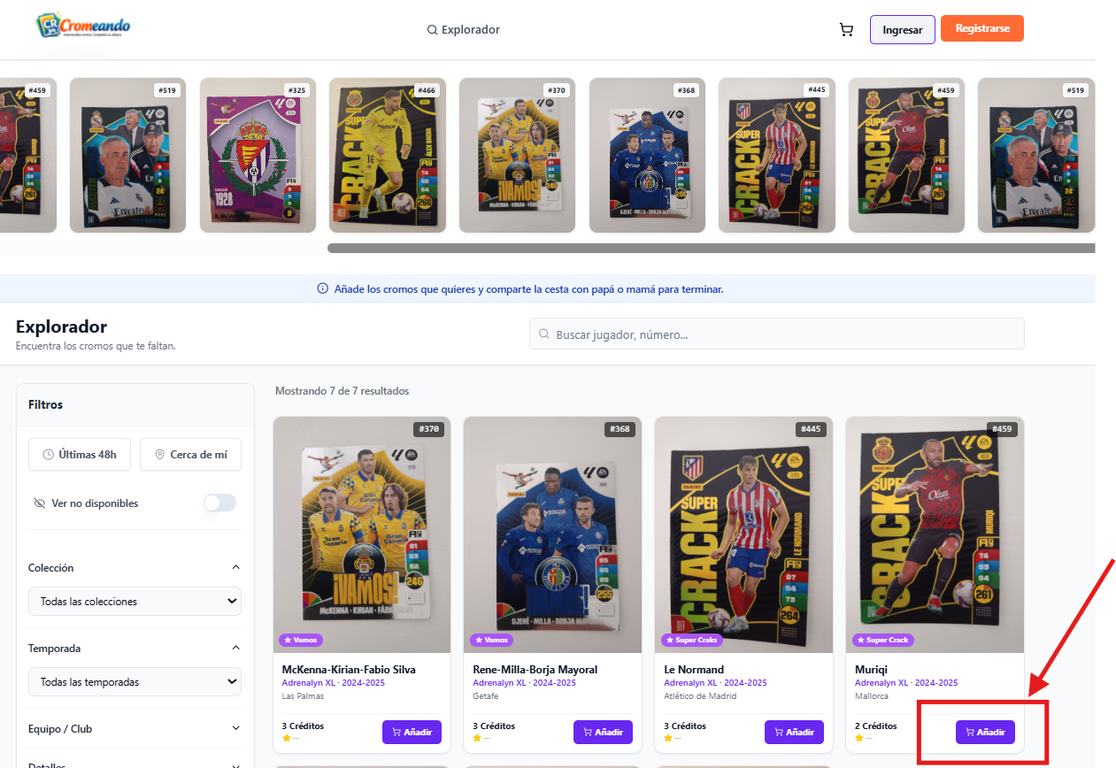 El niño puede marcar y añadir a la cesta los cromos que necesita, participando activamente en el proceso de completar su álbum.